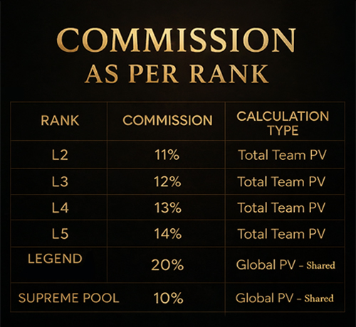 Top achievers — Legend and Supreme — share the Global PV pool, where Legend receives 20% and Supreme receives 10%, recognizing exceptional performance and rewarding leadership with global-level earnings and prestige.